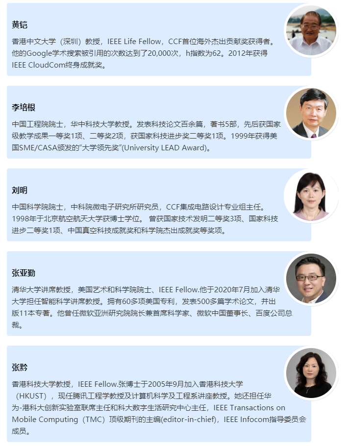 ACM图灵奖获得者John Hennessy、中国工程院院士廖湘科、中国工程院院士李培根、中国科学院院士刘明,美国科学院、工程院院士David Harel,IEEE Life Fellow黄铠,IEEE Fellow张黔,清华大学讲席教授张亚勤、日本情报信息处理协会主席Katsumi Emura
